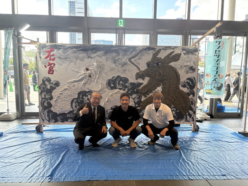 飯野左官は左官アートパフォーマンスとして土壁と漆喰を使用して龍の姿を表現しました。
